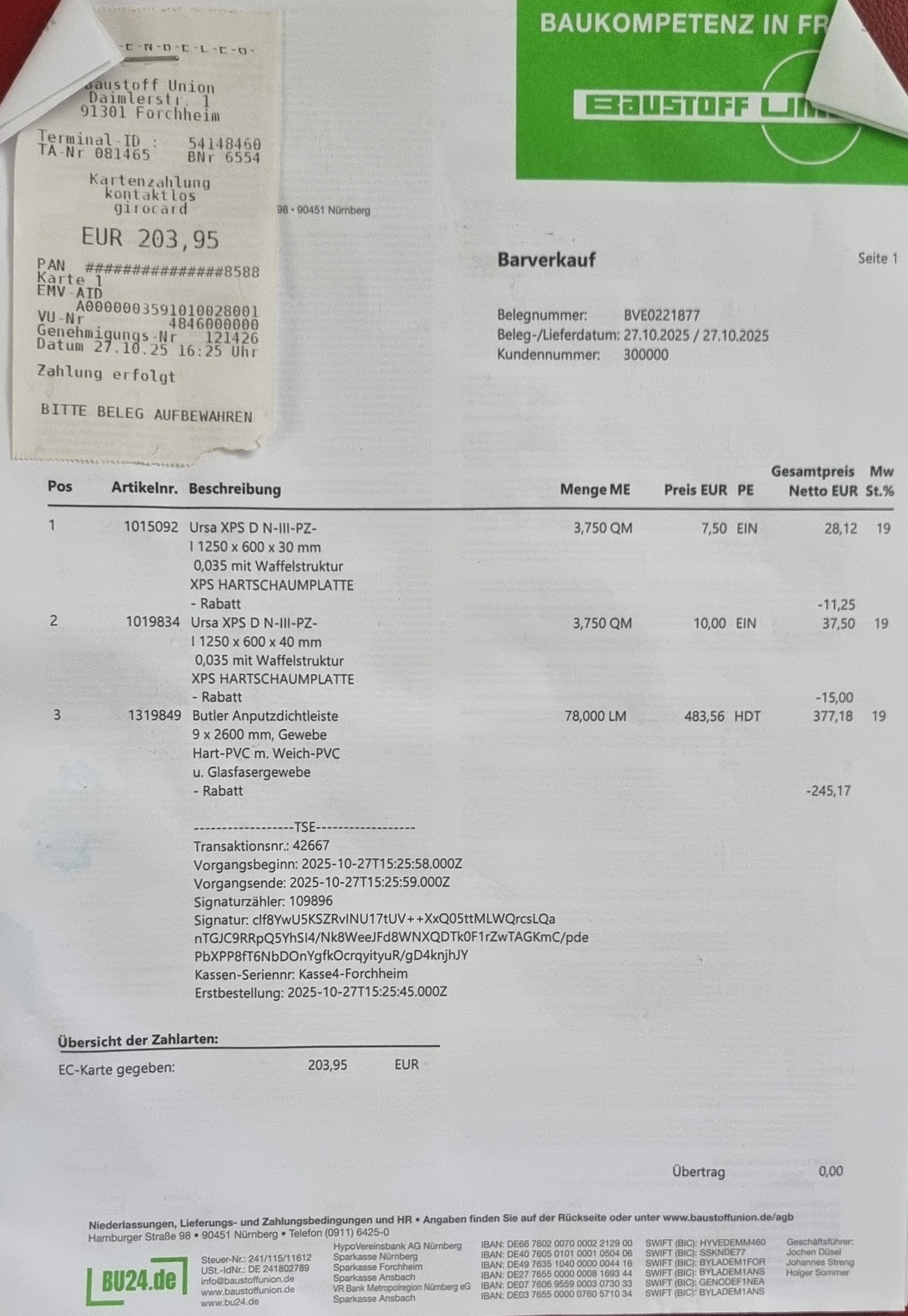 | Bestätigt | 27.10.2025 | BVE0221877 | Baustoff Union | 203,95 € | 20251204_122906.jpg | Bearbeiten |